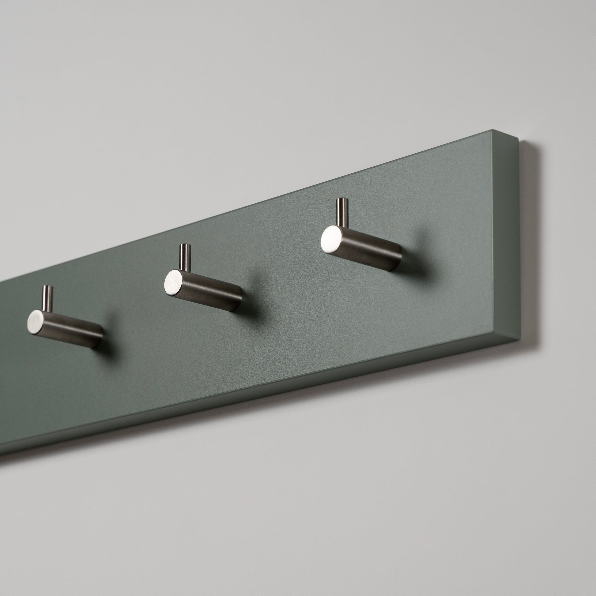 Moderne Wandgarderobe in Eukalyptusgrün, wählbar in 55 oder 70 cm, mit schwarzen oder Edelstahl-Haken.